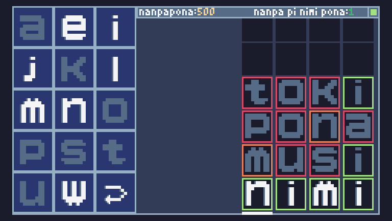 | Tags | TIC-80, toki-pona, Word game, Wordle |